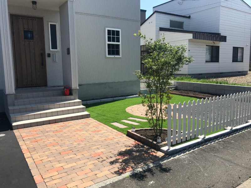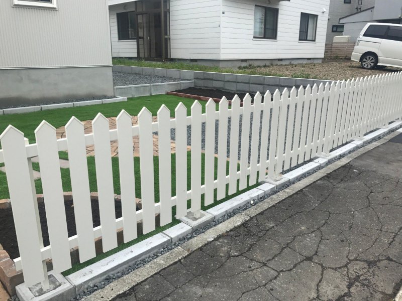 白いアメリカンフェンスとグリーンの人工芝のコントラストがさらに映える。