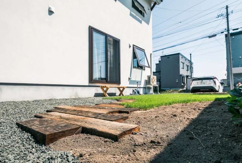 枕木のアプローチは物置までの通路として敷きました。アクセントになるように枕木の敷き方もこだわりました。