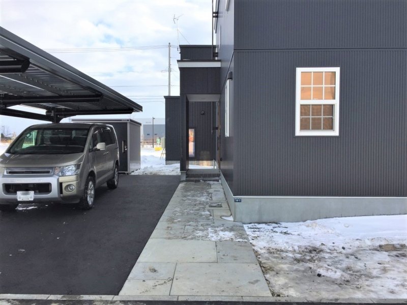 駐車スペースにはアスファルト、その上に鉄骨縦列2台カーポートを設置しました。片持ち柱カーポートなので車の乗り降りを楽にできます。