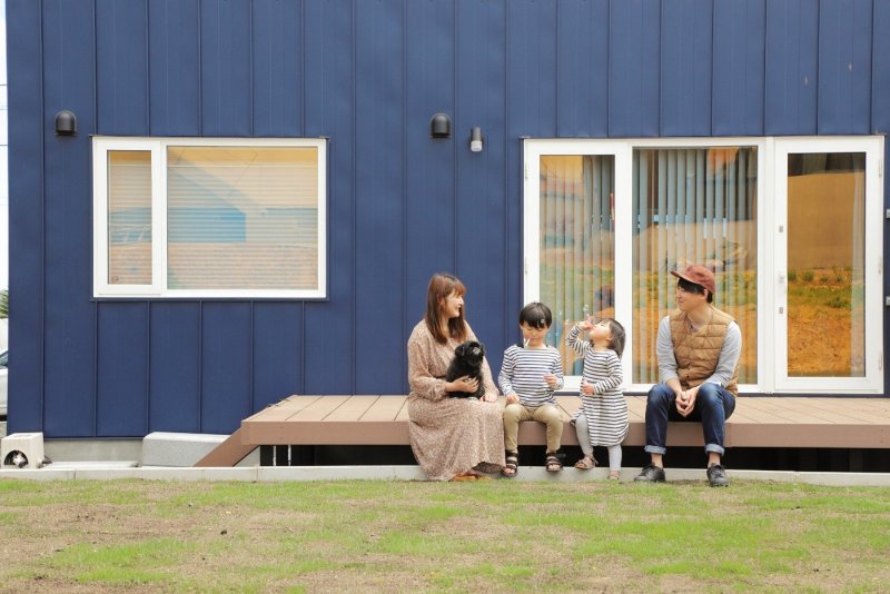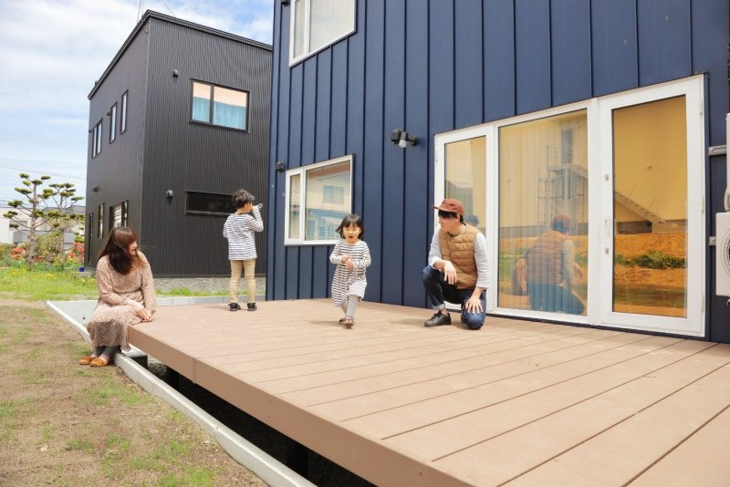 大人数でBBQを楽しんだり、子どもたちが自由に遊びまわったり、家族の時間を育むウッドデッキ!樹脂製のの人工木なのでメンテナンス不要も嬉しいポイントです。