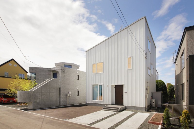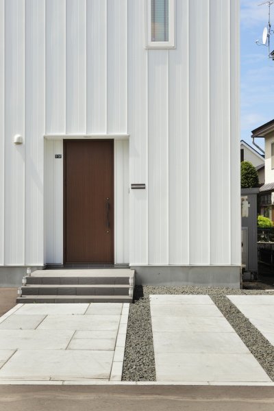 平板をきれいに配列し隙間を犬走砂利で埋めるシンプルなカースペースは、アスファルトのみの施工よりも敷地全体が明るくなります。モノトーンカラーの外構で白のガルバリウムがより際立ちます。よーく見ると愛犬のワンちゃんが窓から顔を出してくれてとてもかわいかったです♪
