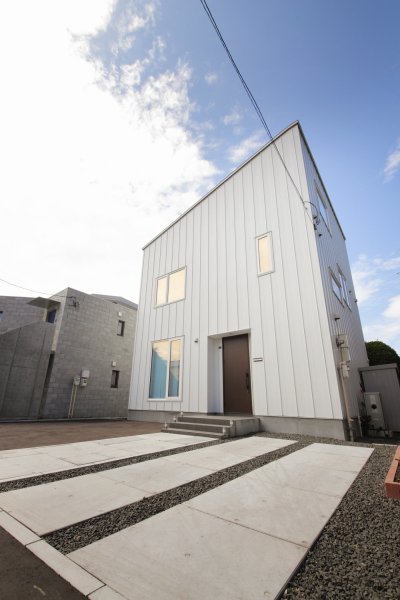 住宅街の中でもひときわ目をひくかっこいい外観デザインを引き立てるよう、シンプルで実用的な外構をご提案しました。