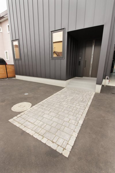 かっこいい外観が引き立つよう、外構はシンプルにアスファルトやグレーのタイルで仕上げています。木目調のフェンスは全体のアクセントに。