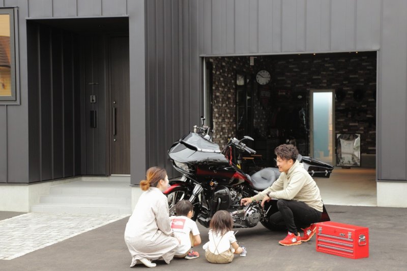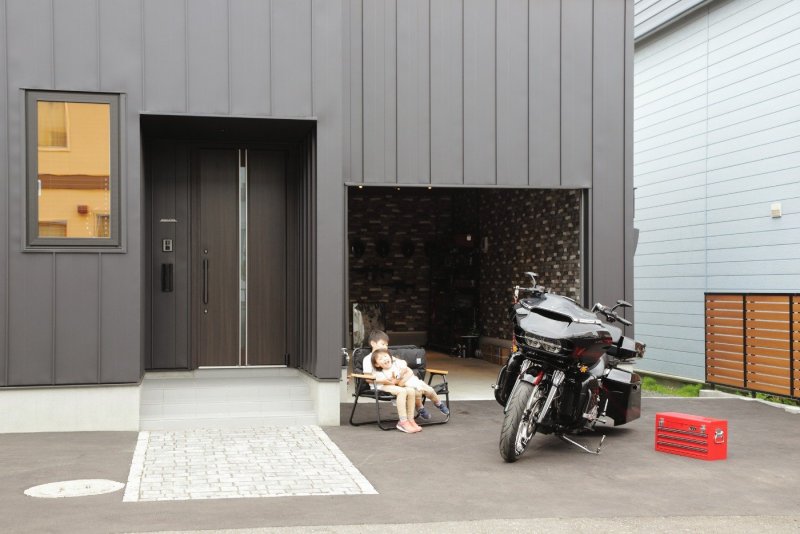 バイクや車を収容しているかっこいいインナーガレージがある家のNさま。他にも大きめの車2台を駐車するスペースやアプローチ、木目調フェンスなどの外構工事をさせていただきました。BBQにぴったりなバルコニーもあり、憧れの暮らしそのものでした!