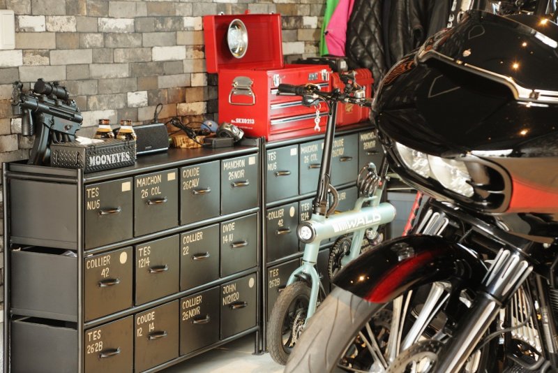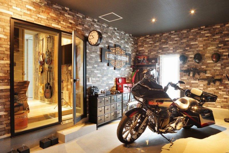 HARLEY-DAVIDSONのディスプレイがとにかくかっこいい!まるでバイクSHOPのようなガレージを拝見させていただきました。ご主人の趣味のギターを楽しむ書斎スペースともつながっていて、男性なら誰もが憧れてしまう空間です。