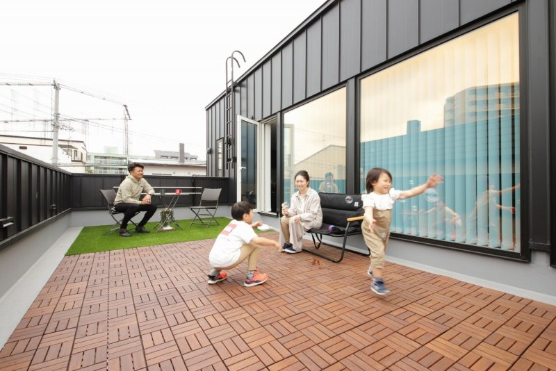 2階リビングの先には日当りの良いバルコニーテラス!ウッド調のタイルや人工芝を敷き、天気の良い日にはご家族でBBQを楽しんでいるそうです。お子さまたちも伸び伸び遊べるステキな空間でした。
