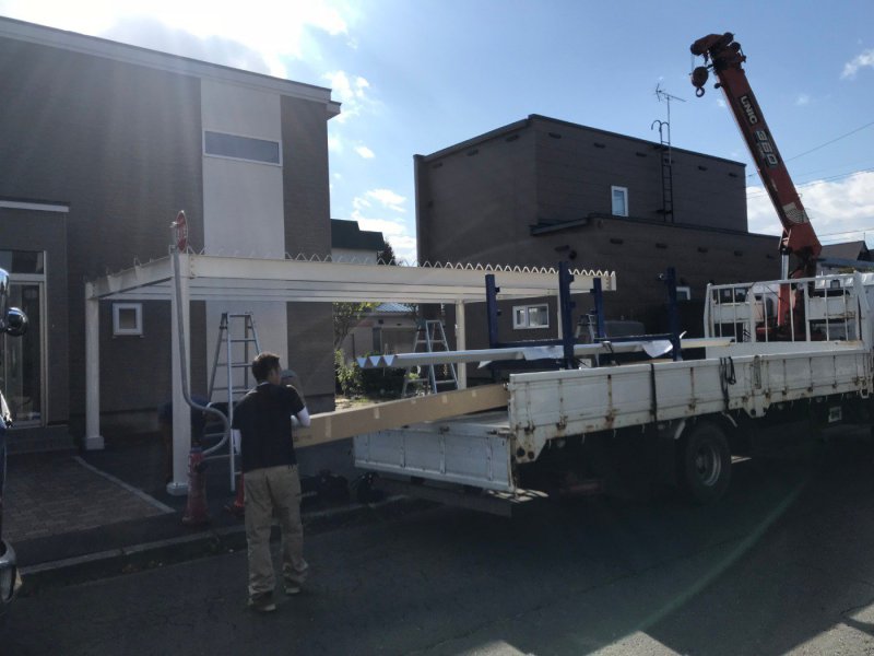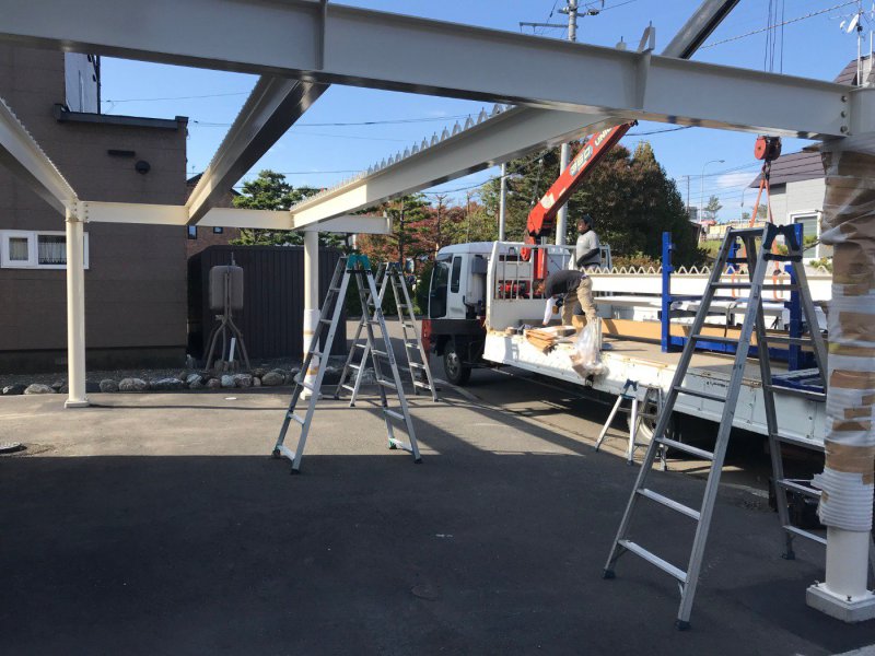 Gallery 大きな鉄骨カーポートのあるお庭 シンプル・モダン 北広島市 Y様邸 お悩み 車を3台置けるカーポートがほしい 冬の除雪が大変・・・ 3台駐車可能!頑丈で安心な鉄骨カーポート 柱が4本、間口幅が7.9mの3台車が入る鉄骨カーポートをご提案!通常のアルミカーポートですと、柱は6本となり、柱が気になったり・ぶつからないかな?と心配になったり・・・しかし、柱や梁が太い鉄骨カーポートなら、全体的に見てすっきりした印象になります。 施工中の様子 鉄骨カーポートの柱や梁は全て工場で製作し、現地で組み立てを行います。組み立てる職人さんは2人しかいないのに、半日で組み立て上げられるので、思っている以上に早くに完成します! この家の施工ポイント アスファルトカースペースカーポート