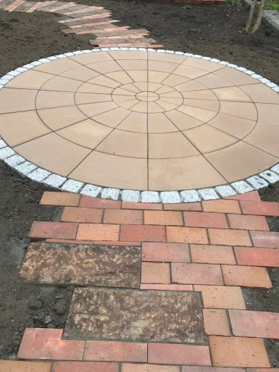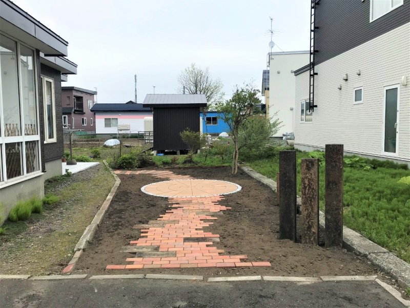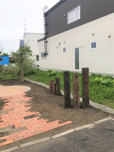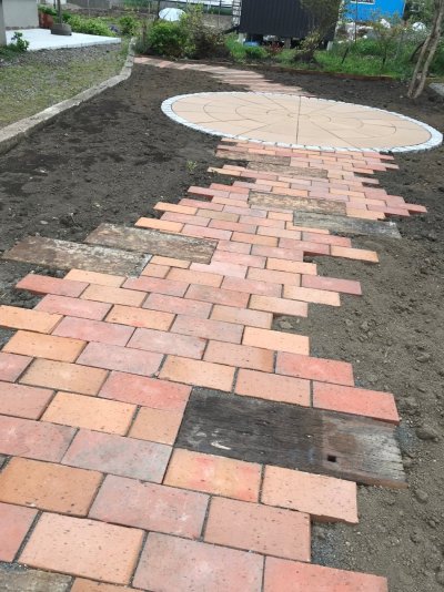 以前は奥様が自分で花壇の中に細道のアプローチを作ってましたが、花壇の中をゆっくり歩けるように広いアプローチを作りました。レンガのアプローチには、ナチュラルな雰囲気になるように枕木をアクセントにいれました!