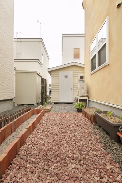 家の裏側にありながら正面から顔をのぞかせる位置に、かわいい物置を配置。外壁はラップ調サイディングを採用し耐久性も考慮しました。DIYの花壇や鉢も置きながら、最近では野イチゴを育てているそうです♪